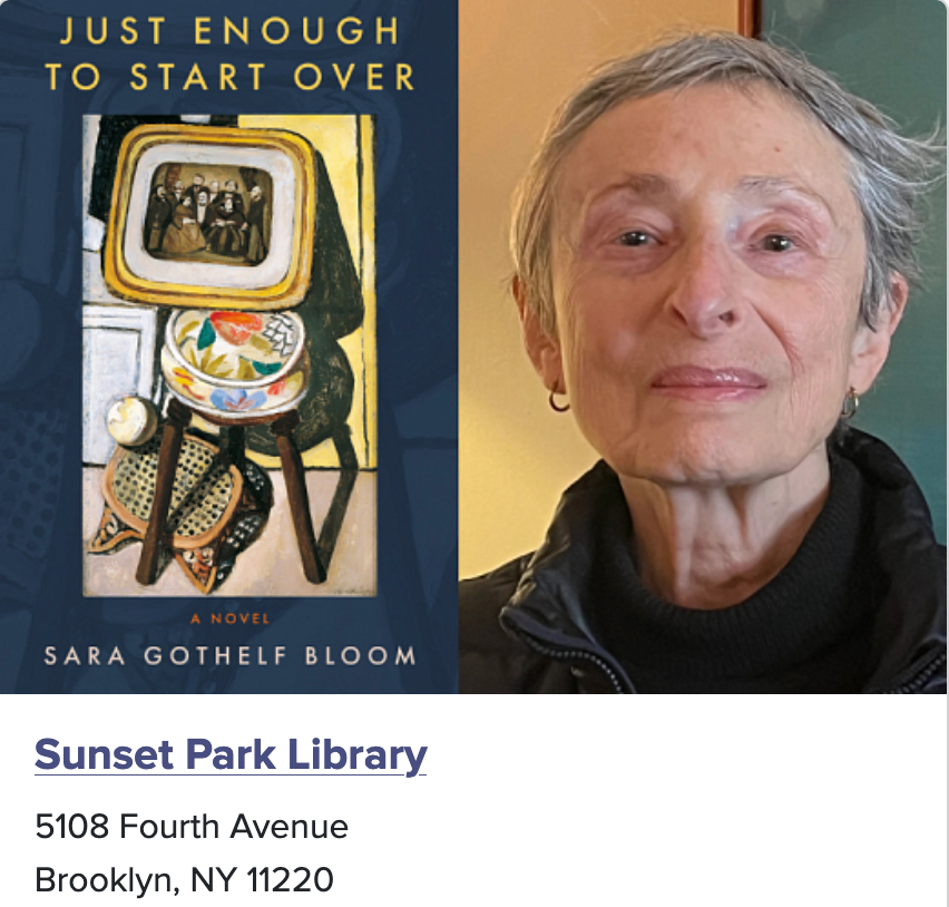 Recommendations department! If You happen to be in New York City, stop by Sunset Park’s branch of the Brooklyn Public Library, where MY MOM, Sara Gothelf Bloom, will be discussing her new novel, Just Enough to Start Over. Thursday April 30, 6pm!